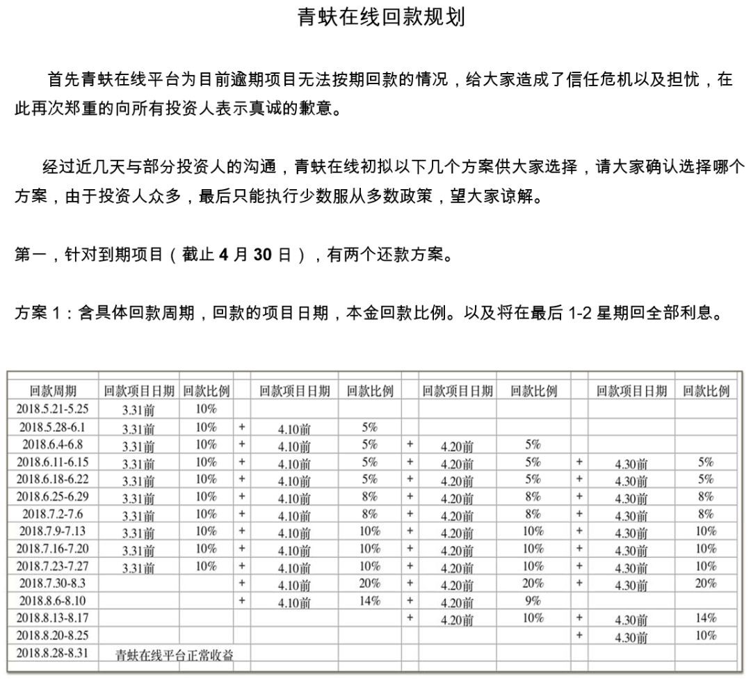 发生逾期的网贷平台青蚨在线在近日发布了回款方案。