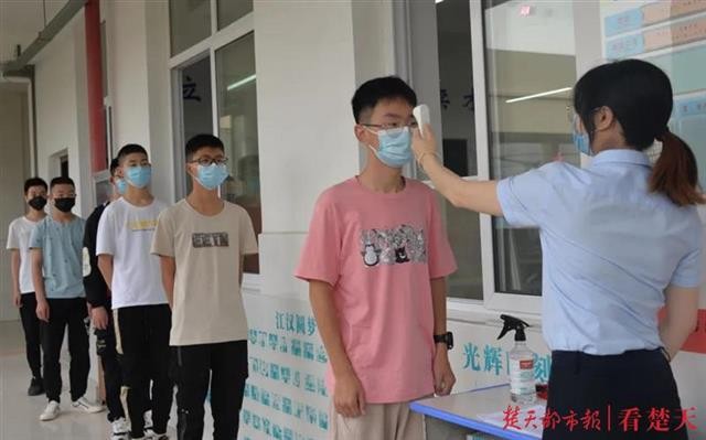 当日上午,天门市汉江学校校园内,数十名志愿者教师和学生在校门口迎接返校的初三学子。学生们手持健康证明,在经过消毒、测温后,保持1米距离进入校园。“学校通知上午8点到校,7点不到就陆续有学生前来报到了。”为保证学生错峰有序返校,汉江学校提前部署复学工作,开学首日秩序井然。天门市教育局领导来校督导复课工作。