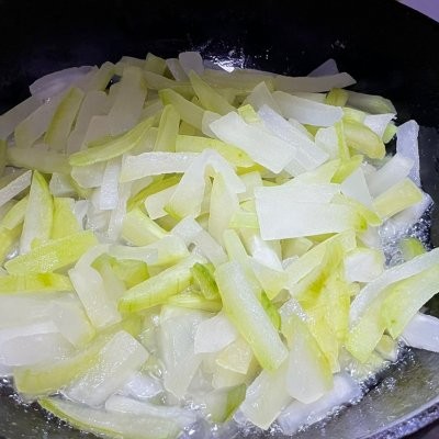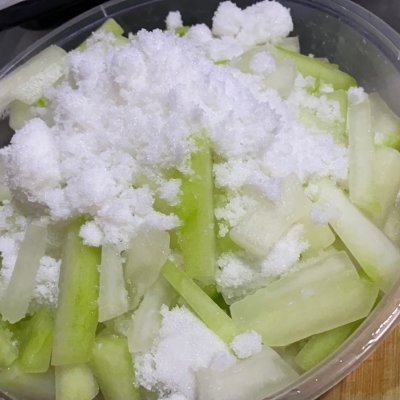 1、食用级生石灰和水1:50 化开,静止5分钟左右,只取上层透明的水,腌制切成条的冬瓜。放冰箱腌制6-8小时