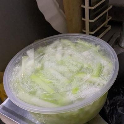 3、腌制好后冬瓜透明且坚硬 (食用级生石灰里面的钙离子让冬瓜变硬)
