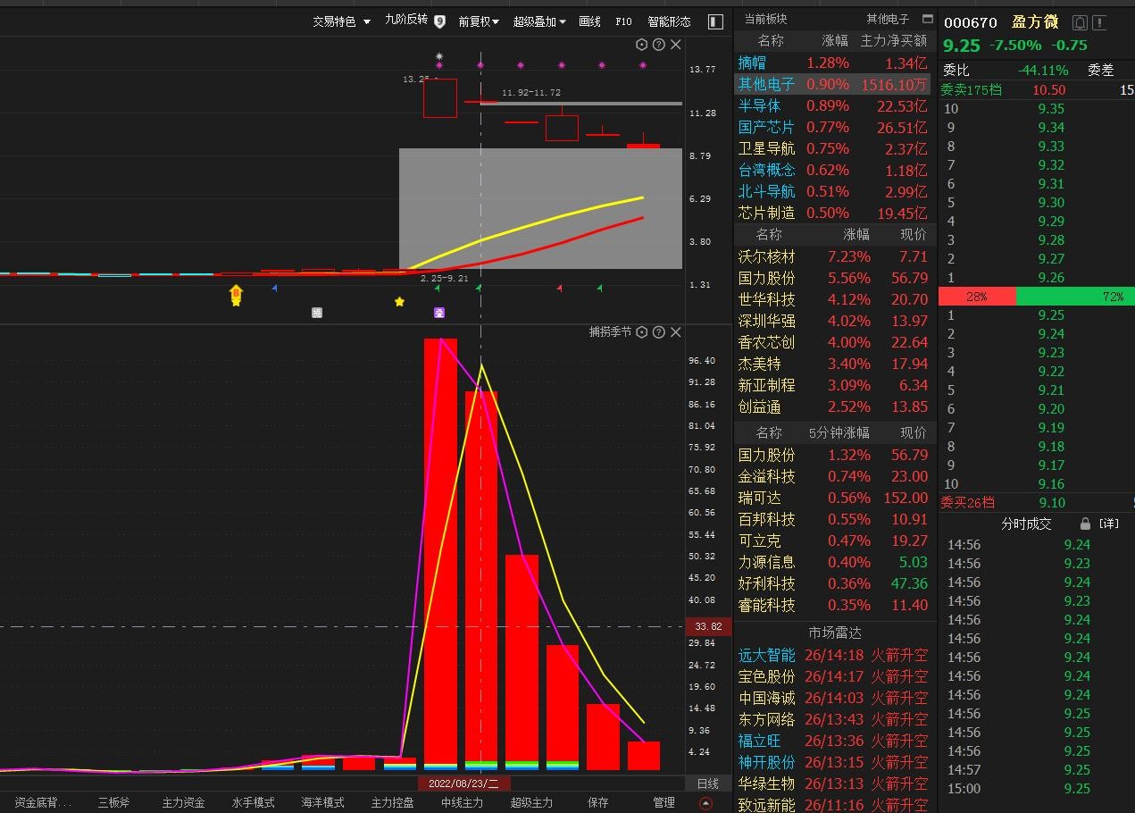 可以看到,目前捕捞季节还是处于紫线下穿黄线的死叉阶段,所以短期而言,想要去把握盈方微机会的朋友们,要留意好金叉的出现,但是同时要注意,这只个股要做到的只是超短,因为大部分资金是有所出逃的,达到一定角度,主力会先自救,我们所要做的就是主力自救这个阶段,所以留意好捕捞季节的金叉信号出现