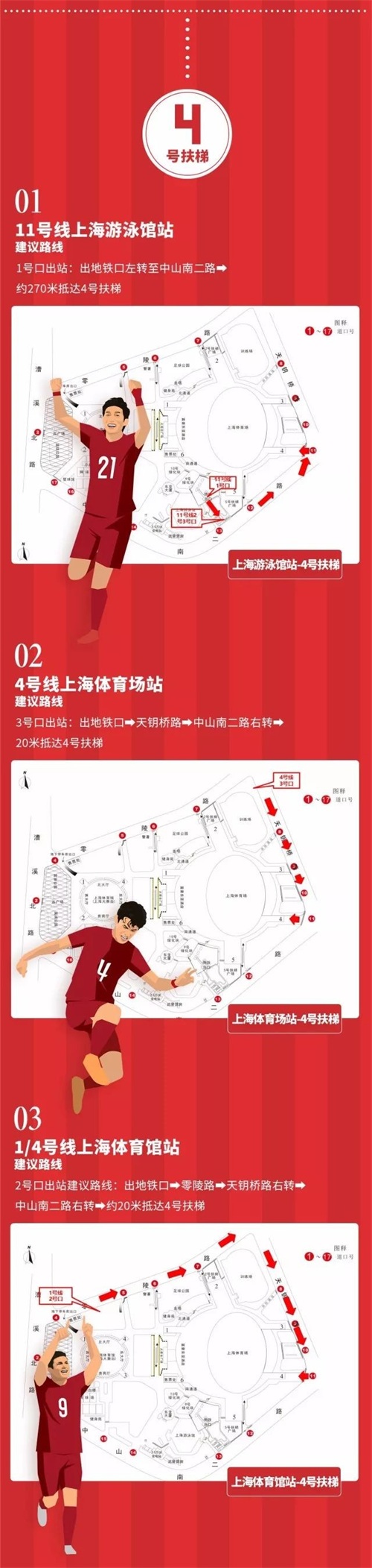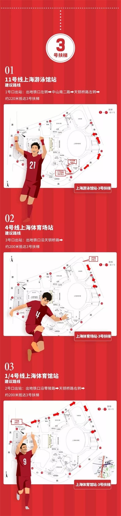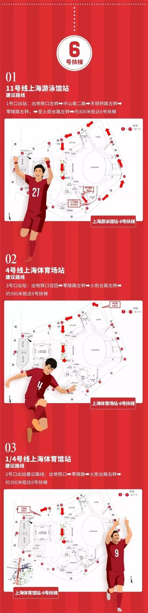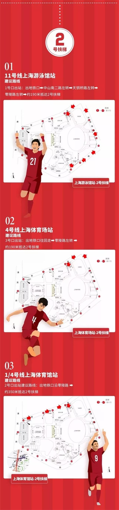 进入体育场的路线——原本能够通往体育场的中山南二路和漕溪路的所有入口都已封闭,球迷们只有从零陵路和天钥桥路上的入口进入体育场。