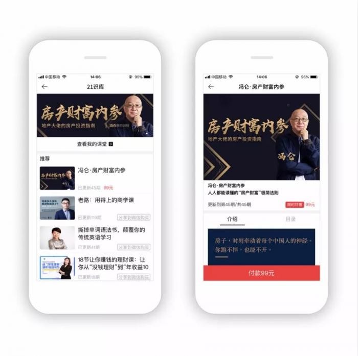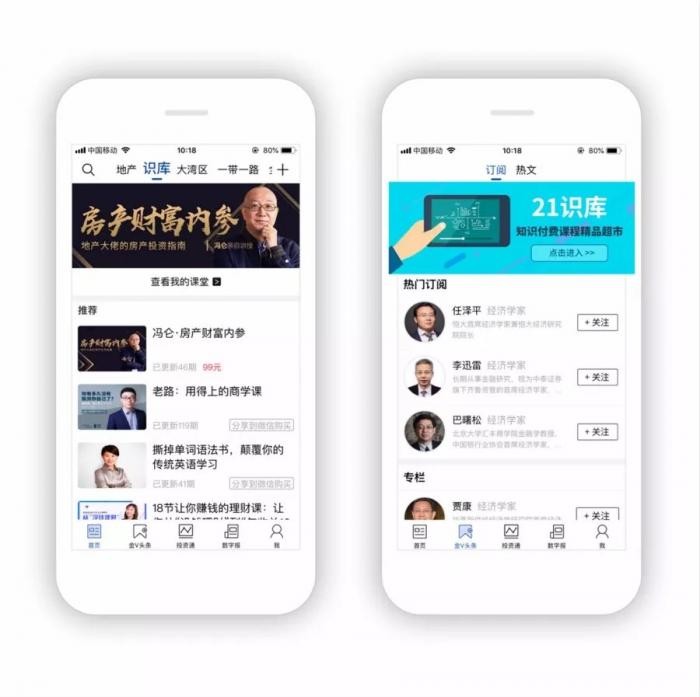 目前,房地产风云人物冯仑、前海开源基金首席经济学家杨德龙、央视主持人陈伟鸿等大咖已入驻21财经APP知识付费频道“21识库”,相关课程均已上线,欢迎各位读者前往查看订阅。