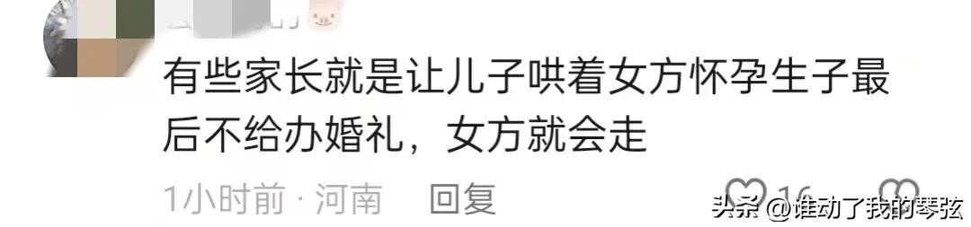还有网友说“有些家长就是让儿子哄着女方怀孕生子最后不办婚礼,女方就会走”。