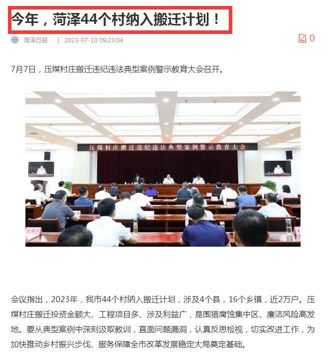 据了解,根据菏泽官媒最新报道。在2023年7月7日,当地召开了“压煤村庄搬迁违纪违法典型案例警示教育大会”。在大会上,就公示了今年菏泽村搬迁村庄名单,纳入搬迁计划的有44个,涉及16个乡镇,近2万户。而搬迁的原因是“压煤村庄搬迁”,并不是因为乡村振兴或者是其它原因搬迁。