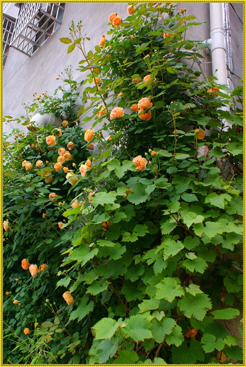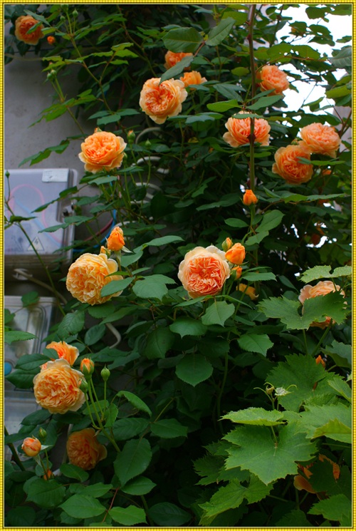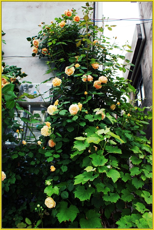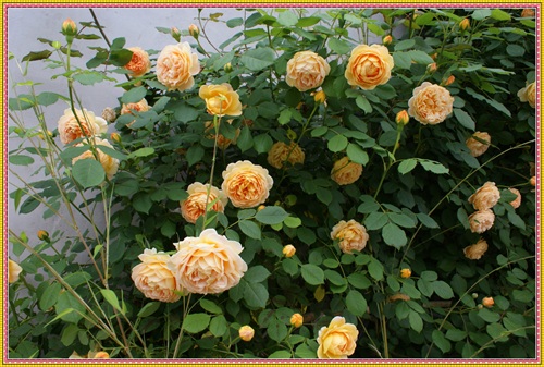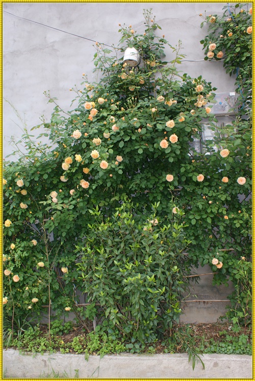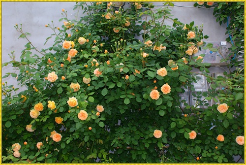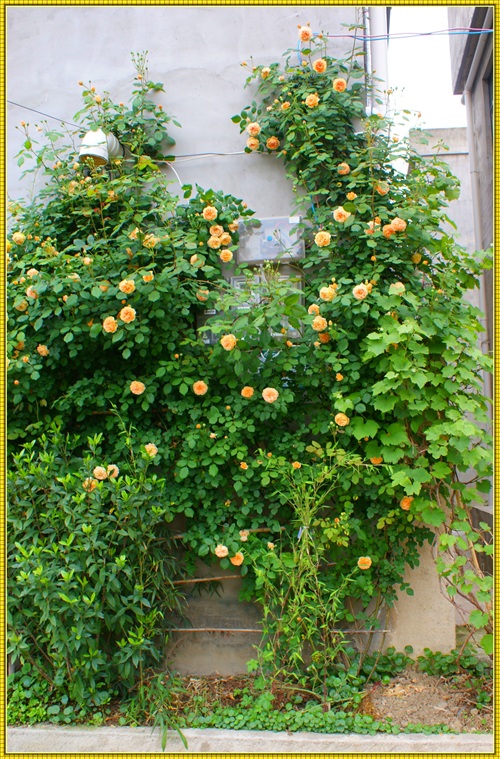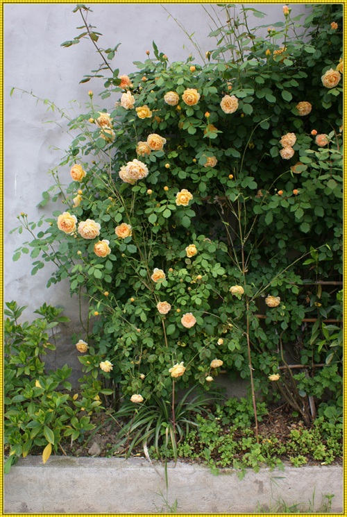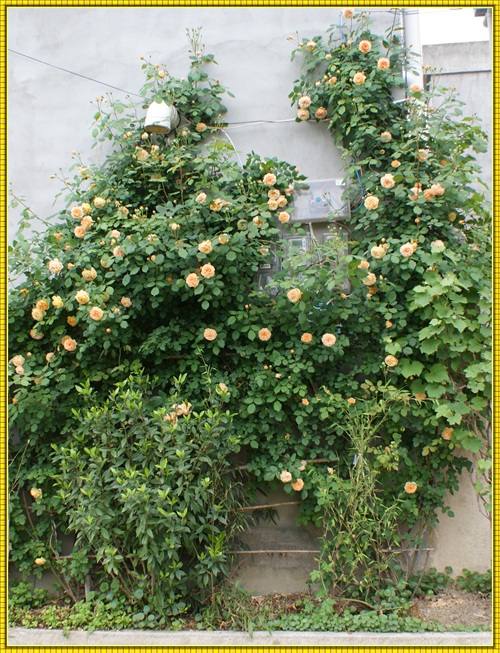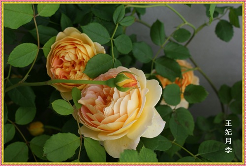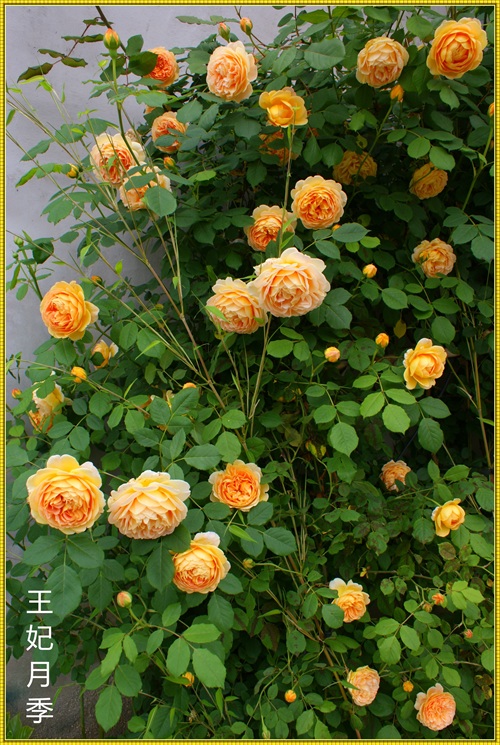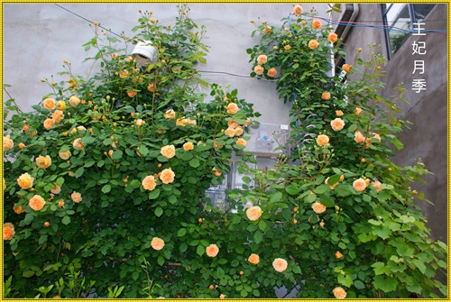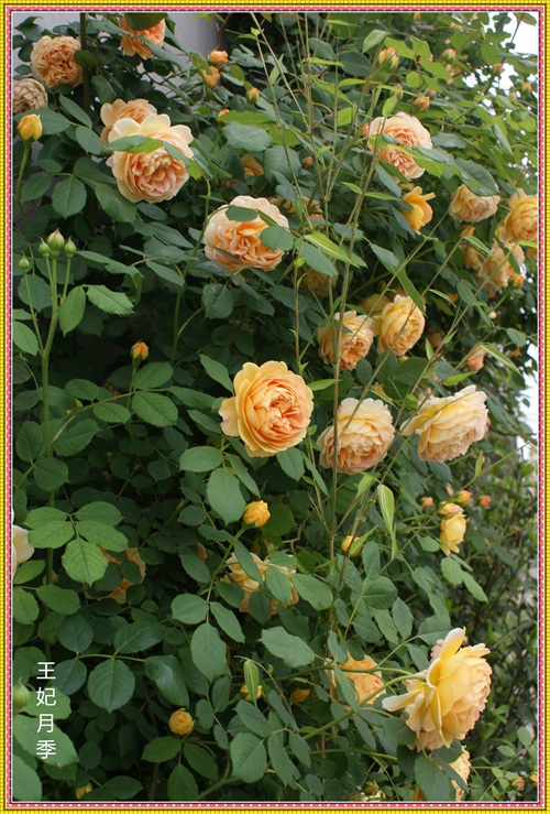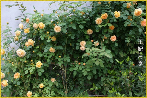 王妃月季属于藤本月季品种,三年就可以长到四米多高,爬满花架。王妃是勤花品红,在冬夏分明的地区,从三月一直开到十二月。花落花开,天天不断。杏黄色的花朵,重瓣,花瓣密约百片左右。带有清淡的水果芳香。只要主人辛勤地搭好各式不同的花架,它就能呈现出主人心仪的形态。心形、拱门,争奇斗艳。