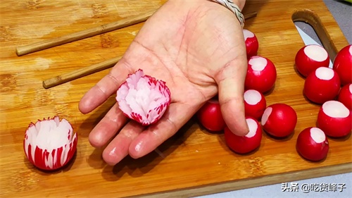 1.先将樱桃小萝卜清洗干净后摘下萝卜樱子,再将小萝卜的头和尾去掉,然后取两根筷子放在小萝卜的两侧开始切薄片,放筷子的作用是防止将萝卜切断,这样切出的萝卜底部是相连的,切好片后再将小萝卜旋转45度继续交叉着切片,最后切出的小萝卜会呈现一朵菊花的形状,十分漂亮又很入味!