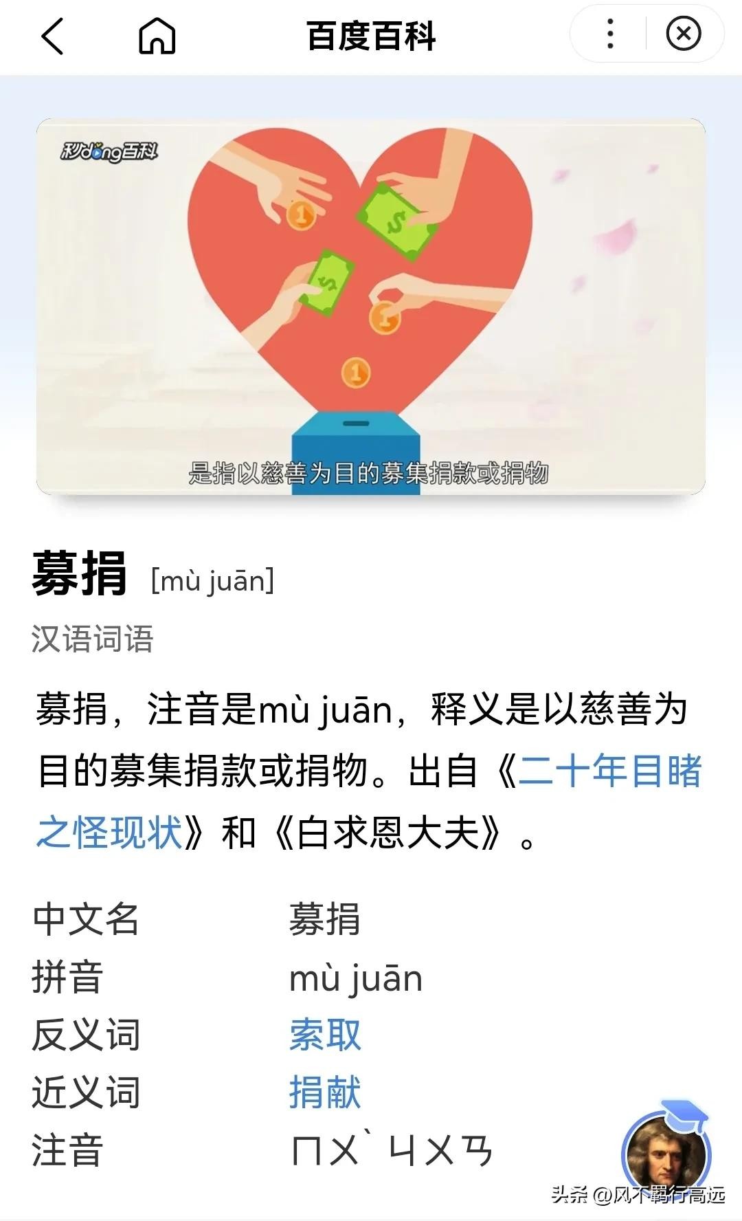 查阅百度百科,释义如下:以慈善为目的募集捐款或捐物。出自《二十年目睹之怪现状》和《白求恩大夫》。