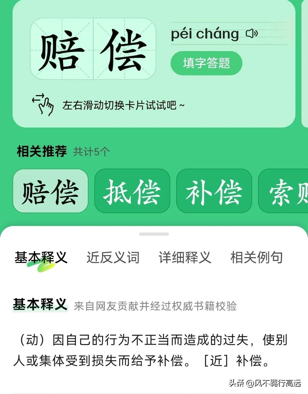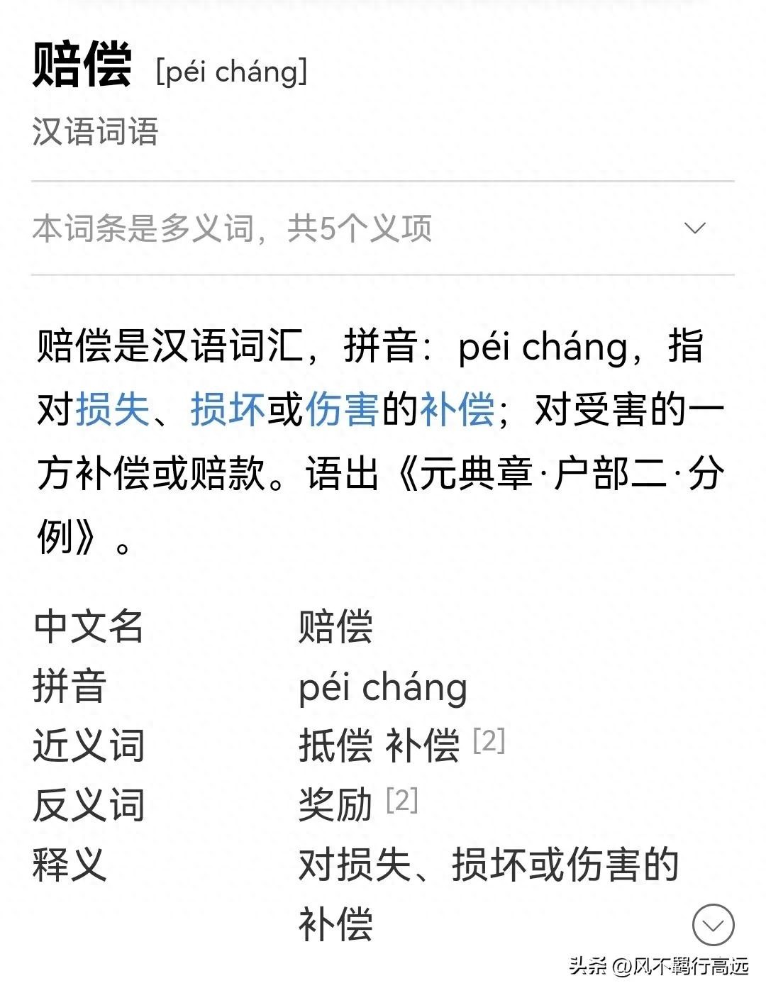 查阅百度百科,释义如下:对损失、损坏或伤害的补偿;对受害的一方补偿或赔款。语出《元典章·户部二·分例》。