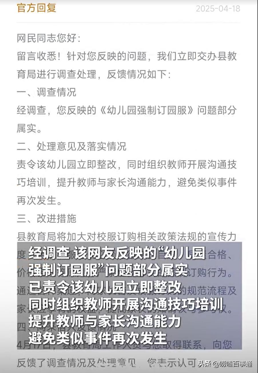 事件曝光后,南乐县委县政府督查服务中心迅速介入。调查结果一锤定音:强制订购园服问题部分属实。