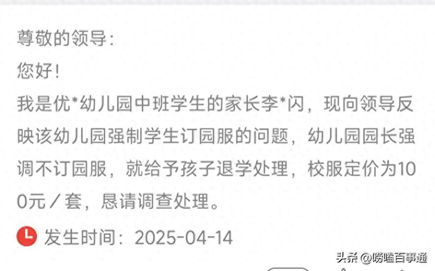 2025年4月,南乐县某幼儿园的一场家长会,成了家长的“噩梦”。园方抛出重磅消息:每套园服100元,必须订购,否则孩子将“无法继续就读”。