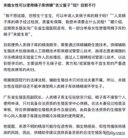 随后副院长给出了回答,受限于目前的人工受孕技术和我国的法律法规,只有合法夫妻在满足条件下可以申请,未婚女性现阶段还不能申请。