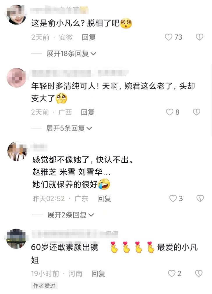 网友们看了俞小凡的近照后,都惊讶不已,纷纷留言称,这是俞小凡吗?脱相了。也有人说,俞小凡年轻时多么清纯可人啊,天啊,竟然这么老了,头都变大了。还有人说,都快认不出来了,感觉都不像俞小凡。