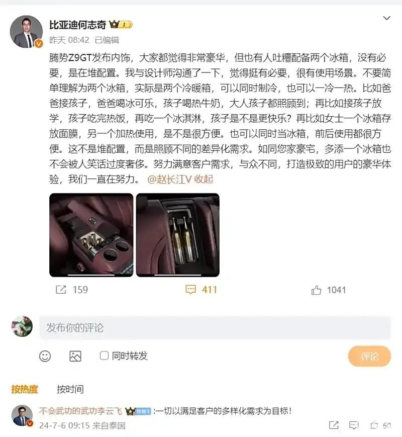 但何志奇觉得冤枉,在回应贴中表示:“这不是过度设计。两个冰箱实际是两个冷暖箱,可以同时制冷,也可以一冷一热。这不是堆配置,而是照顾不同的差异化需求。”何志奇认为,爸爸喝可乐,孩子热牛奶,女士冰面膜,都能照顾到。比亚迪公关总监李云飞也评论说:“一切为了用户。”