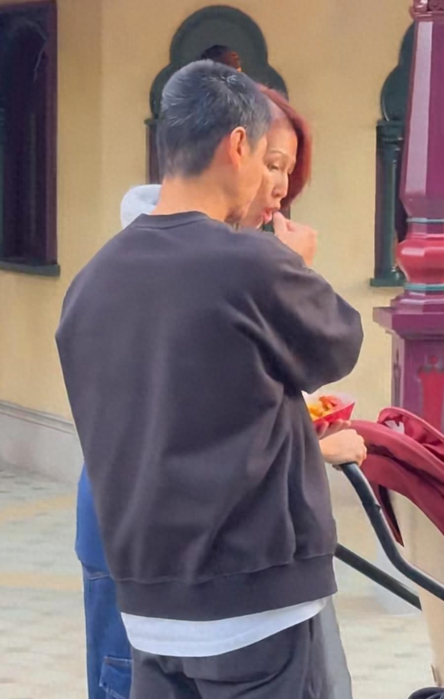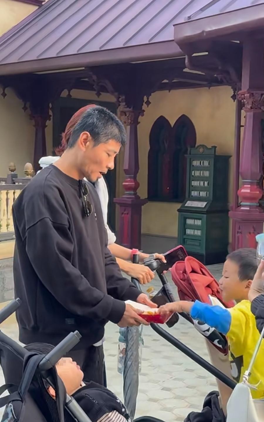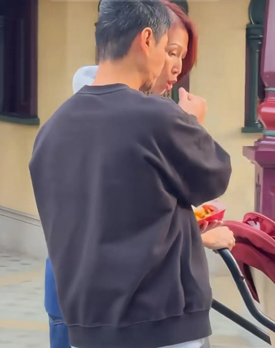 在迪士尼乐园,我们看到蔡少芬推着婴儿车,张晋则拿着小吃,两人配合默契,共同照顾着孩子。