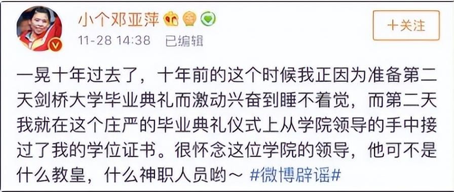 邓亚萍的求学之路并非一帆风顺。2010年,她在剑桥大学毕业典礼上按照传统向导师下跪领取学位证书的照片在网上流传,引发了巨大争议。