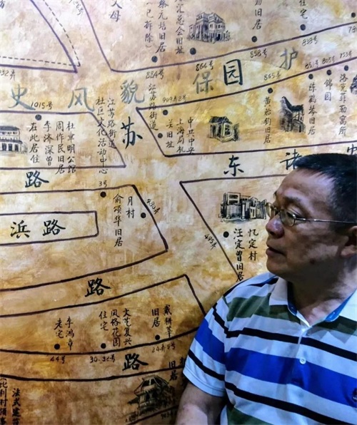 ▲ 俞梅荪在江苏路历史文化建筑地图标注的“俞颂华旧居”前,介绍1946年,祖父母和家父入住江苏路480弄的往事