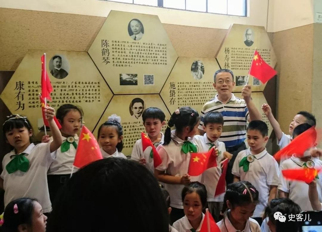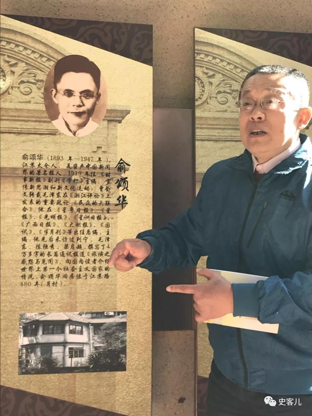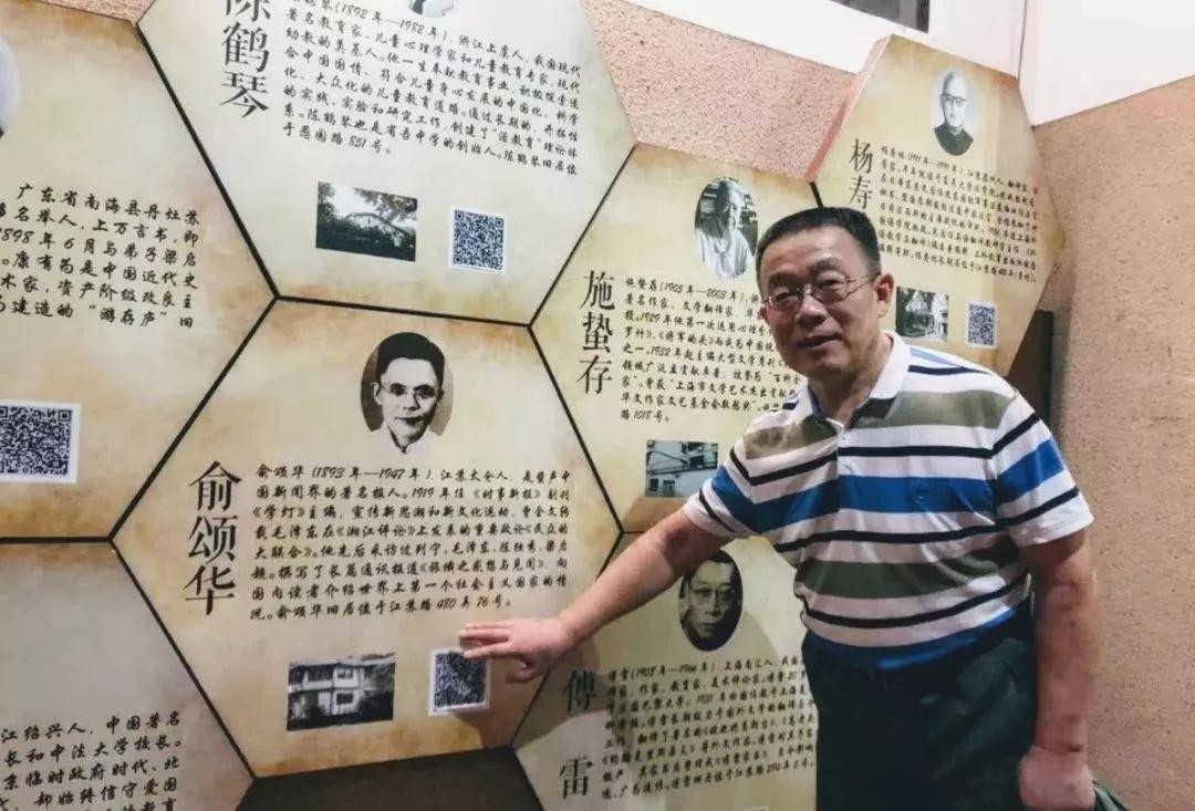 ▲ 2019年8月21日,在上海愚园路1065号《历史名人墙》,俞梅荪介绍祖父俞颂华的往事。