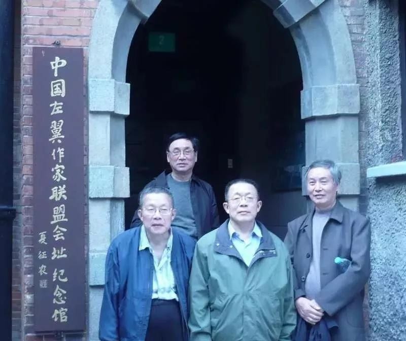 ▲ 2013年,上海多伦路“左联”纪念馆,鲁迅、茅盾、俞颂华等不少文化人曾在此活动。左起,俞颂华之孙俞颂荪、俞梅荪,史量才的侄孙、后排夏征农(左联成员,上海市委老领导)的秘书。