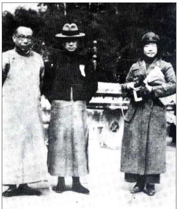 ▲ 1936年到广州筹备中国社会教育社时俞庆棠与中山大学校长邹鲁(左)、梁漱溟(中)留影。