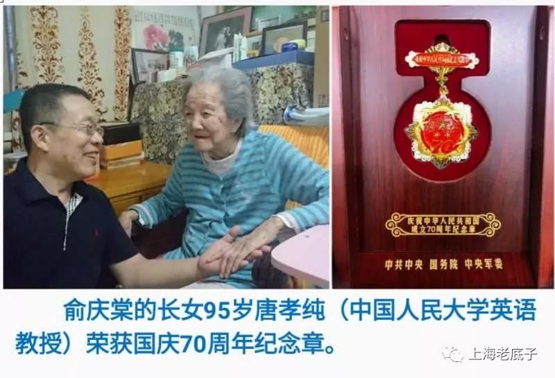 ▲ 俞庆棠的长女95岁唐孝纯(中国人民大学英语教研室原主任)荣获国庆70周年纪念章。1970年代,老布什任美国驻北京联络处主任期间,唐孝纯曾任其专职中文教师和翻译。老布什后为美国总统。唐孝纯是我的姑姑。