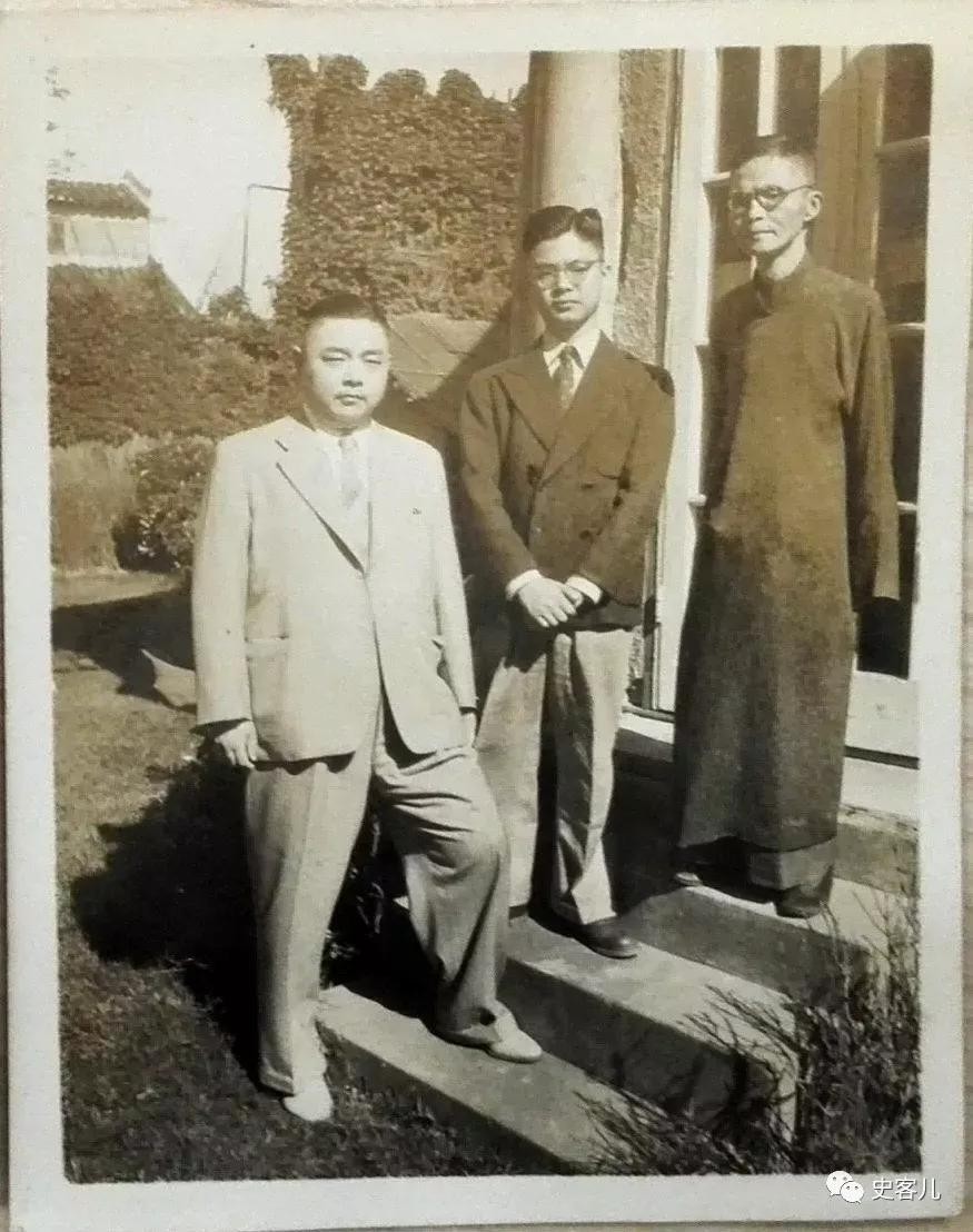 ▲ 1945年,抗战胜利的次年,贫病交加的俞颂华一家回到上海,租住江苏路480弄76号假3层的单间。右起:祖父俞颂华、家父俞彪文、房东钱道希在楼下合影。(俞颂华时任国立教育学院新闻系主任,1947年5月,全国“反内战”学潮,不少学生被开除,重病中的俞颂华找校长据理力争,抗议开除学生,悲愤交加,当场吐血,旧病发作而去世;为此,学生都未被开除。俞彪文在东吴大学法学院和沪江大学商学院毕业,在国民政府中央信托局保险处工作,拒绝迁往台湾或香港,1949年5月前往北京参加开国大典,创办中国人民保险总公司;1957年反右运动被迫害致死,1979年平反昭雪。)