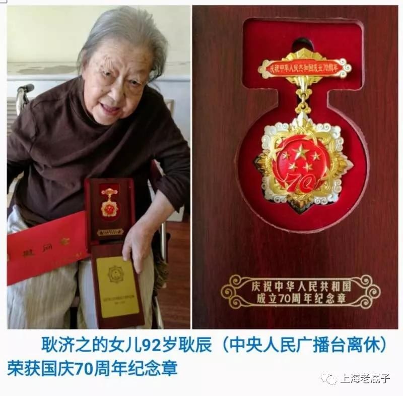 ▲ 2岁耿辰(中央人民广播台离休)荣获国庆70周年纪念章,她的父亲耿济之(国际歌的译者)是我祖父俞颂华的妻妹夫,耿辰是我的姑姑。