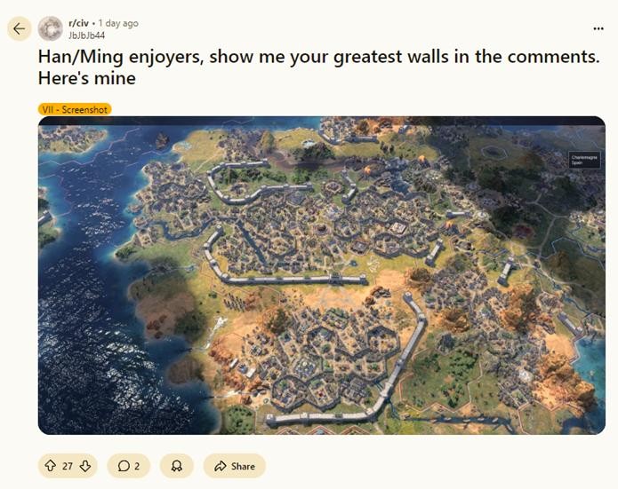以及就像上面提到的,“修长城”是中华文明的独特玩法内容之一,而国内外的《文明》社区向来不缺“长城信徒”,对他们而言,选择中华文明,然后建一条既美观又实用的长城,就是很酷很快乐。
