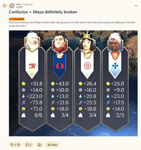 当然,这未必总是个好现象——社区里也有不少玩家抱怨领袖孔子和另一个强力文明玛雅都过于超模,成了“非Ban必选”,实际削弱了游戏的整体可玩性。