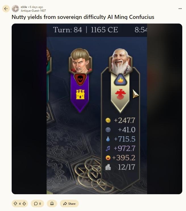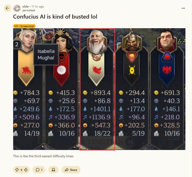 尤其是《文明7》首发时的质量不甚理想,几天来一直在修复Bug、改了不少公式,结果一来二去,虽然没直接削孔子,但实际把孔子原本最大的优势给砍没了,一时跌落神坛。
