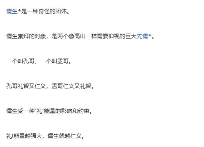 他本人化身“范马孔次郎”,影射《刃牙》漫画里的肌肉战斗狂;他的学说被称作“孔虐”,是《战锤》系列邪神“恐虐”的谐音;儒生的口号也跟着变成了“学祭学神,儒献儒座”“学而不思则Waaagh,思而不学则Dieeee”。