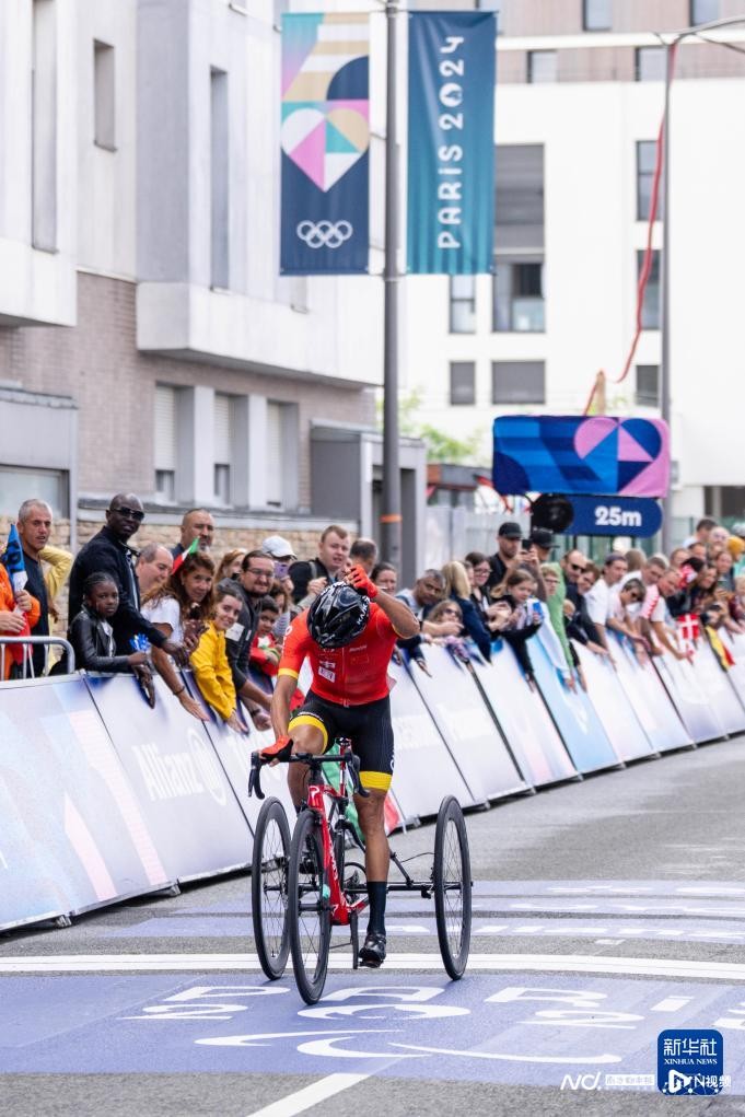 在巴黎残奥会公路自行车男子公路赛T1-2级比赛中,中国选手陈健新以1小时15分08秒的成绩夺得冠军,陈健新顽强拼搏的一幕感动了许许多多国人。图源:新华社
