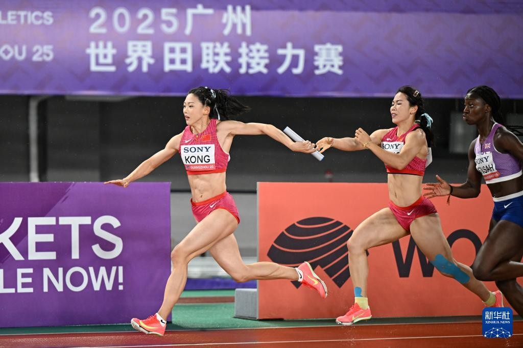 5月10日,在广州天河体育中心举行的2025年世界田联接力赛混合4x100米接力预赛中,中国队第一棒黄淑萍(中)与第二棒孔玲瑶(左)在比赛中交接棒。图源:新华社