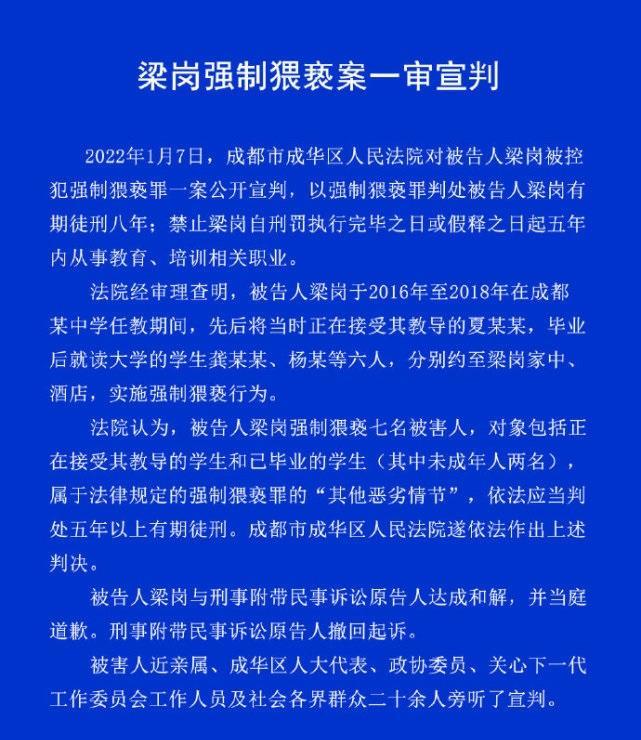 最终四川省成都市成华区人民法院,就梁岗的行为给出了判决:以强制猥亵罪判处被告人梁岗有期徒刑八年,禁止梁岗自刑罚执行完毕之日或假释之日起五年内从事教育、培训相关行业。