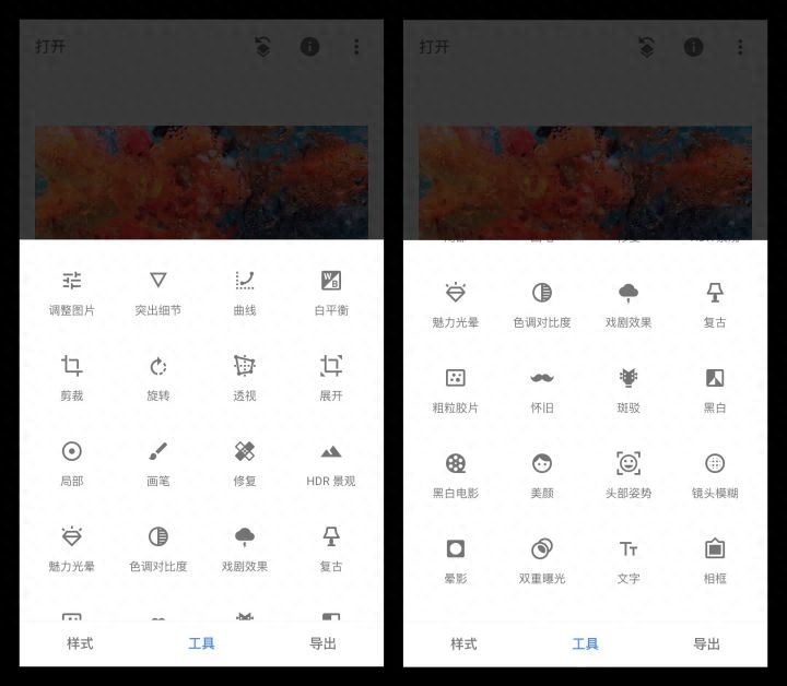 导入图片之后在【工具】页面中使用各项工具对照片的参数进行调节,总共有 28 个小工具,这里面部分小工具是滤镜。这些滤镜是:「HDR 景观」、「魅力光晕」、「戏剧效果」、「复古」、「粗粒胶片」、「怀旧」、「斑驳」、「黑白」、「黑白电影」。