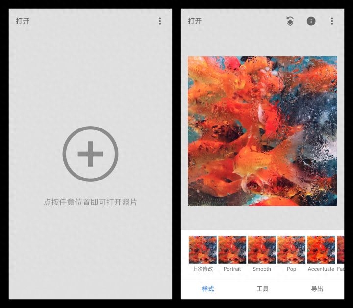 Google开发的一款全面而又专业的手机照片编辑工具,可以精细控制图片的各项参数,打开之后的页面也比较简单,点击+可以直接导入图片进行编辑。