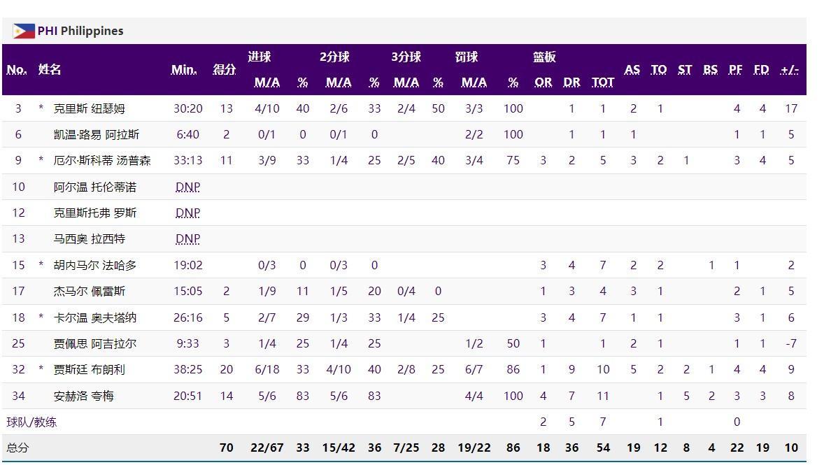 菲律宾归化球员布朗利贡献全队最高的20分,“约旦科比”朗戴-霍利斯-杰弗森拿到全场最高的24分。