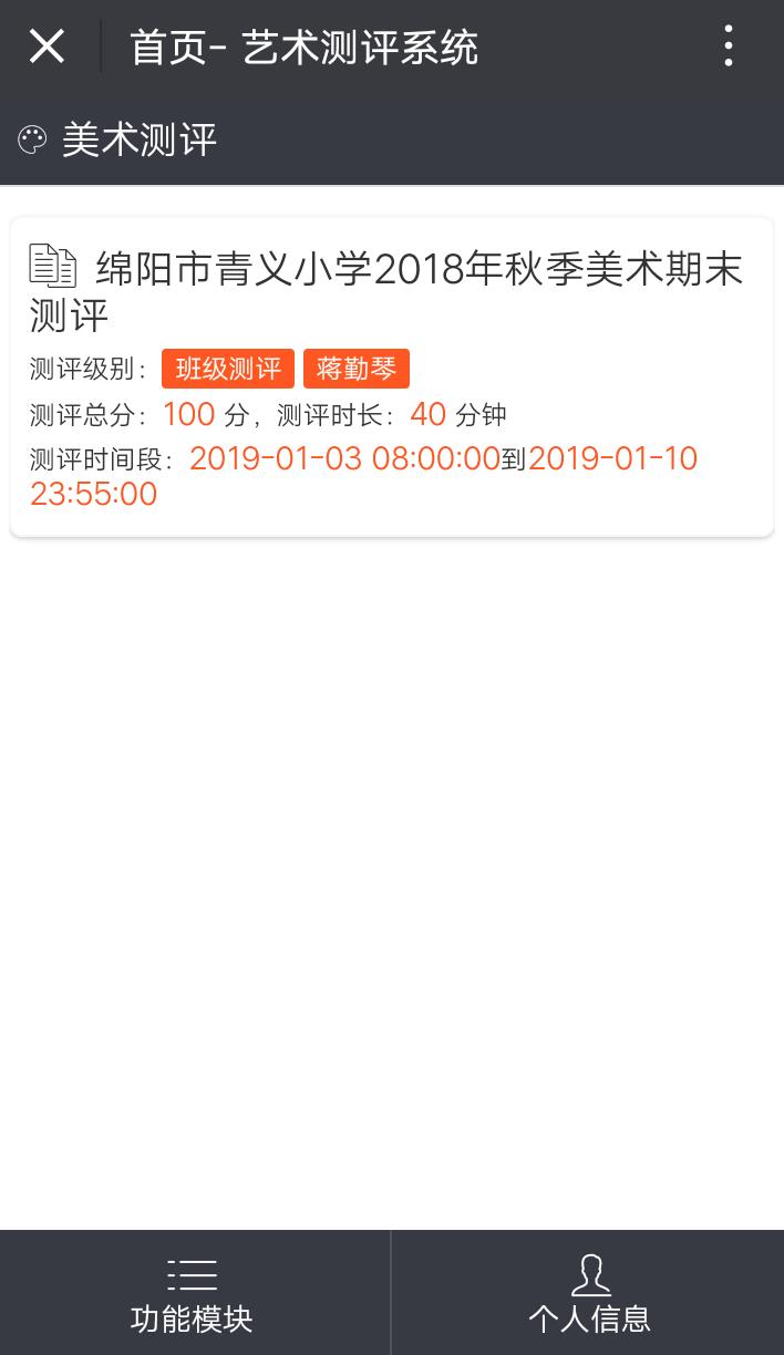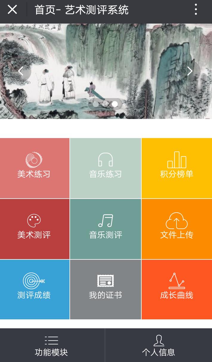 4、下图可看到美术练司、音乐练习、积分榜单、美术测评、音乐测评等内容。每次想回到下图页面只须点最下方的功能模块便可。我们点美术测评。