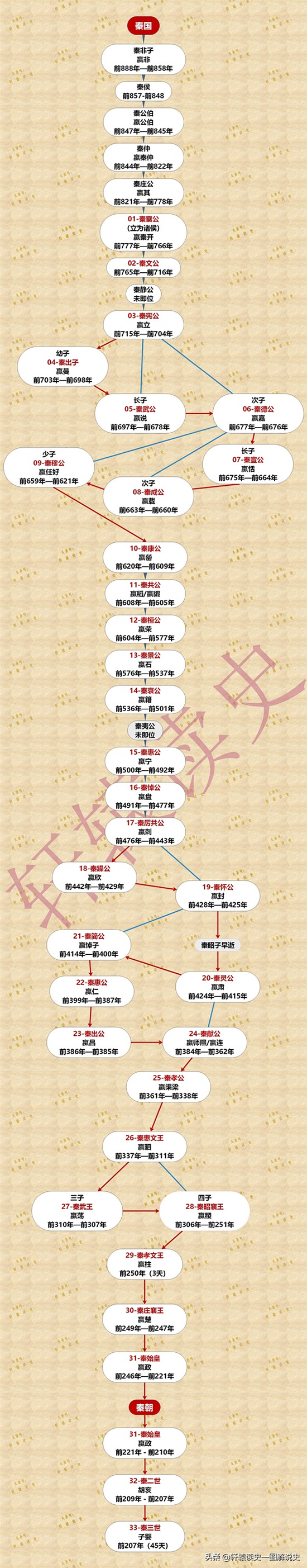 秦国国君顺序图表介绍(图解秦国33代帝王传承顺序)