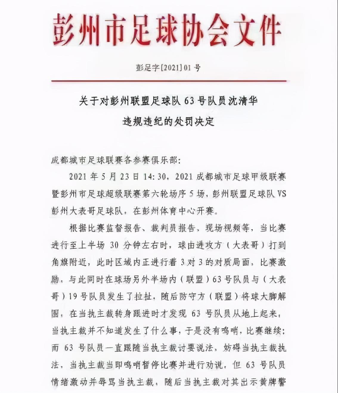 近日,有博主爆料称,在成都下辖彭州市的一场业余足球比赛中,出现了严重的暴力伤人行为。一名业余球员不满主裁判判罚,不仅出言不逊辱骂对方,而且飞身一脚踹向主裁判,导致对方受伤。从网络上流传的图片也能看到,主裁判的大腿上有5道明显的血印和大面积的淤青。据了解,这名伤人的球员叫沈清华,隶属于彭州联盟队。赛后,当地足协立即作出处罚决定,涉事球员被罚款1000元,终身禁赛,禁止参加成都市足协以及所属单位举办的所有足球比赛。