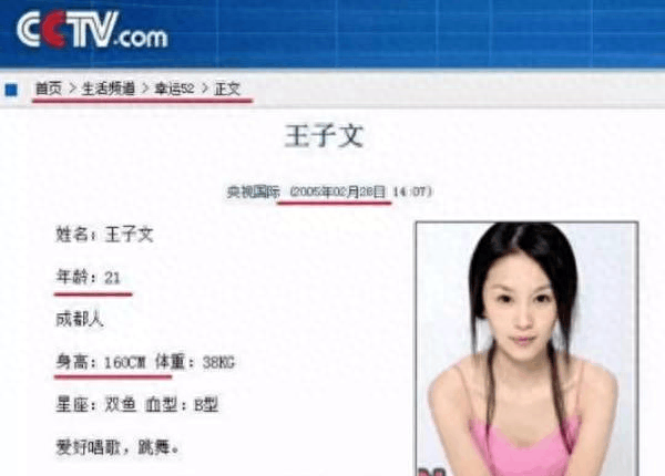 此外,王子文的年龄也是个迷。根据百科显示,王子文生于1987年,身高162cm。但是在遥远的11年前,2005年《幸运52》有一期315特辑,王子文做奖品模特,当时档案里显示年龄是21岁,也就是生于1984年。
