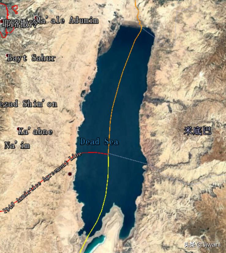 死海位于以色列(左下), 巴勒斯坦(左上)、约旦(右侧)交界
