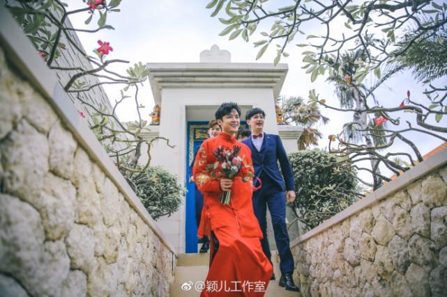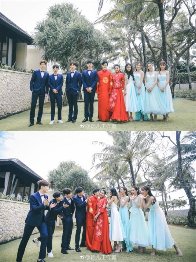 在工作室晒出的照片中,新娘新郎和伴郎伴娘们的合照也是超级养眼啊,不过比起帅帅美美的伴郎团伴娘团,身着一身红色喜服的颖儿和付辛博更是十分抢眼。