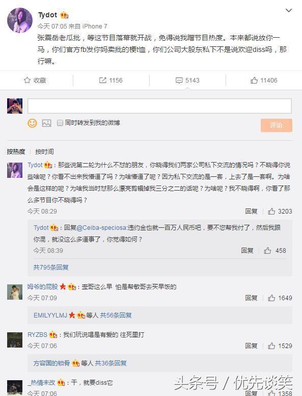 这之后,微博上便开始掀起各种骂战,Ty的铁粉、路转粉以及不明真相的吃瓜群众纷纷去攻陷张震岳的微博,就连Ty本人也在微博上表示,自己是不是被节目组做成了“效果”?下周60秒,他要diss张震岳,让他见识一下什么才叫真正的Hiphop!