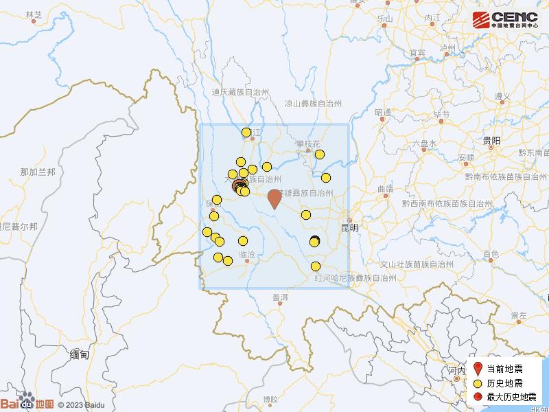 根据中国地震台网速报目录,震中周边200公里内近5年来发生3级以上地震共114次,最大地震是2021年5月21日在云南大理州漾濞县发生的6.4级地震(距离本次震中106公里),按震级大小前50次历史地震分布如图。
