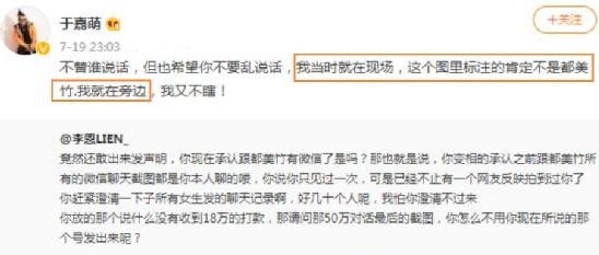 这时,吴亦凡的好友于嘉萌转发了这条微博,自称当时就在现场,照片中的女孩并不是都美竹。同时他还在评论区回复网友,表示照片中红色脏辫的人就是他。