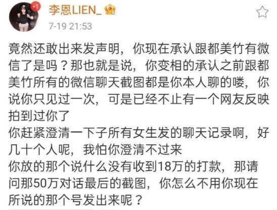 李恩的发言乍看之下都是站在都美竹一边,但是她言语行为却屡屡出现漏洞,有意无意地给别人落下话柄。7月19日,李恩接受媒体直播连线的时候,一直对着镜头整理自己的头发,频繁的小动作也让网友心生疑惑。