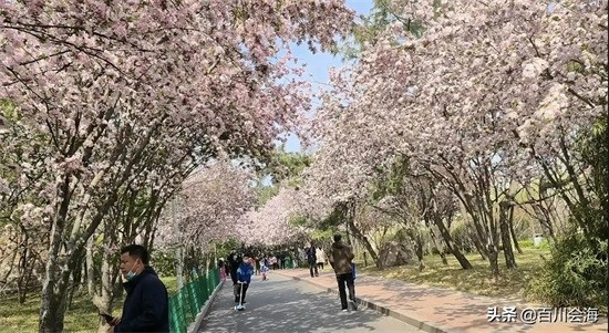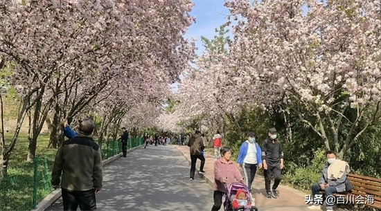 四月的李村公园,最靓丽的风景莫过于公园南侧的网红路海棠大道了。海棠大道长200多米,道两旁的海棠树枝蔓在空中交织,遮天蔽日。海棠盛开,满树艳红,一树树海棠花争奇斗艳,占尽春色,微风吹来,树枝摇拽,婀娜多姿,飘飘洒洒的花瓣,洒满路面,美不胜收,伴随着阵阵花香,令人流连忘返。游人们纷纷拍照留念,永留这春日的美好。