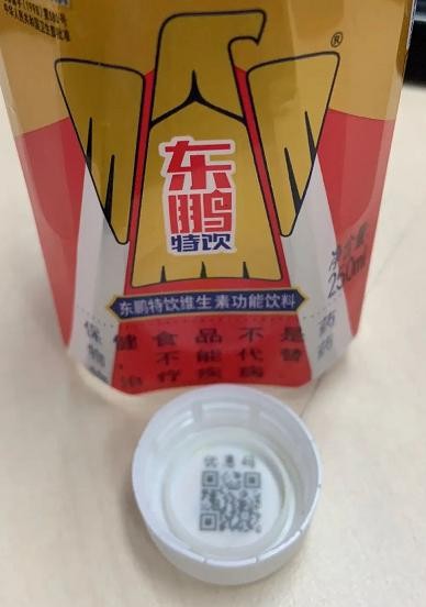 ▲250ml“东鹏特饮”维生素功能饮料瓶盖内外两个二维码。李佳榕/摄