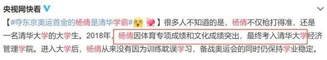 冠军和清华,这两个头衔放在一起已经足够吸引人眼球。一时间,很多人都觉得杨倩一定是体育竞技强、文化成绩好。